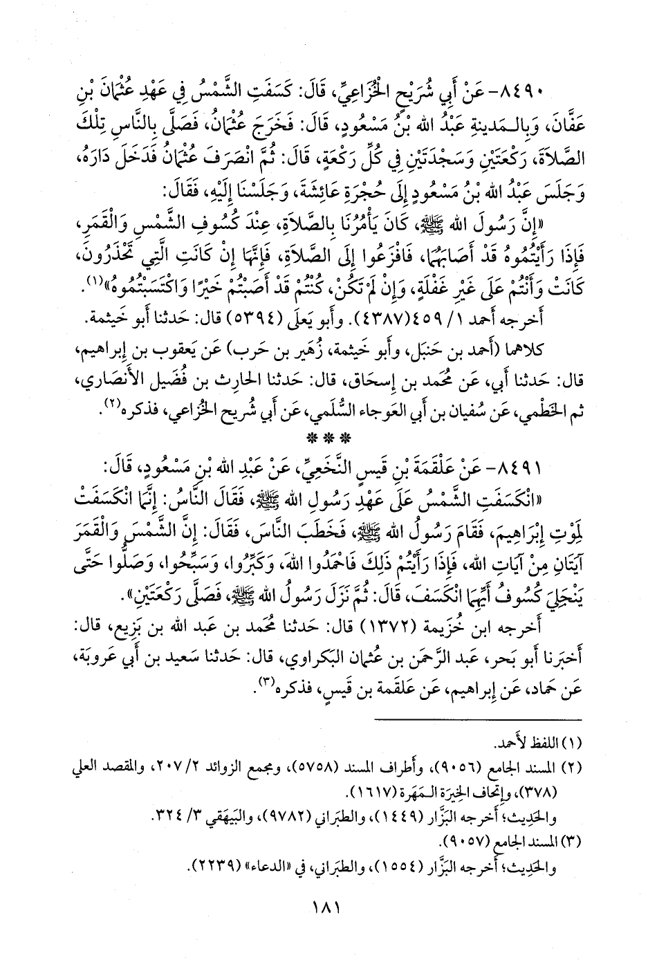 ٨٤٩٠ - عن أبي شريح الخُزاعي، قال: كسفت الشمس في عهد عثمان بن عفان، وبالمدينة عبد الله بن مسعود، قال: فخرج عثمان، فصلى بالناس تلك الصلاة، ركعتين وسجدتين في كل ركعة، قال: ثم انصرف عثمان فدخل داره، وجلس عبد الله بن مسعود إلى حجرة عائشة، وجلسنا إليه، فقال: