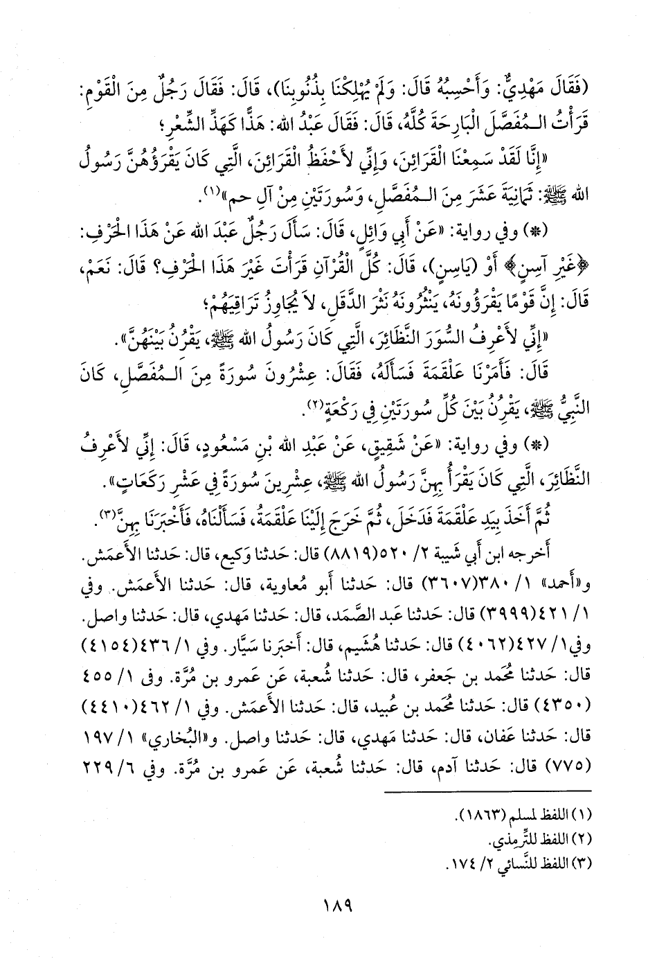 - وفي رواية: «عن شقيق، عن عبد الله بن مسعود، قال: إني لأعرف النظائر، التي كان يقرأ بهن رسول الله صَلى الله عَليه وسَلم عشرين سورة في عشر ركعات».