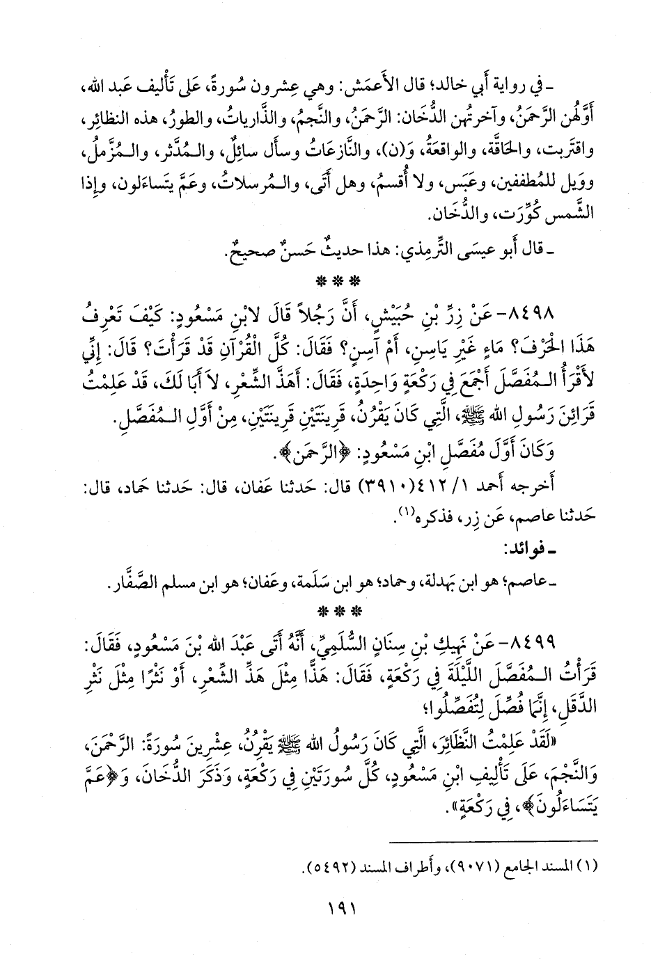 «لقد علمت النظائر، التي كان رسول الله صَلى الله عَليه وسَلم يقرن، عشرين سورة: الرَّحمَن، والنجم، على تأليف ابن مسعود، كل سورتين في ركعة، وذكر الدخان، و {عم يتساءلون}، في ركعة».
