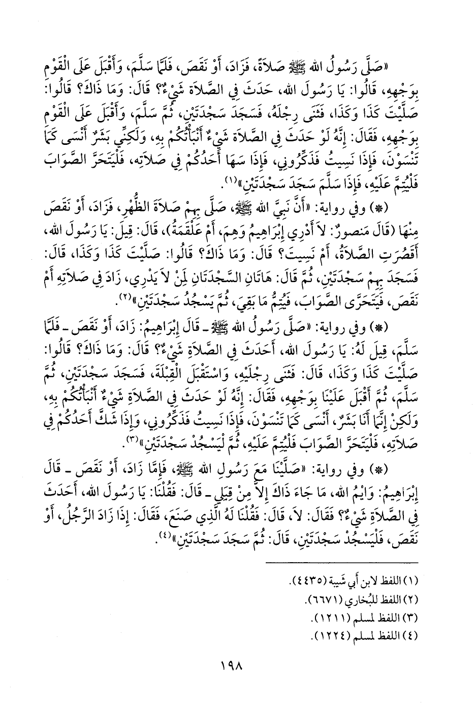 - وفي رواية: «عن علقمة؛ أن عبد الله بن مسعود سجد سجدتي السهو بعد السلام، وحدث أن رسول الله صَلى الله عَليه وسَلم سجدها بعد السلام».