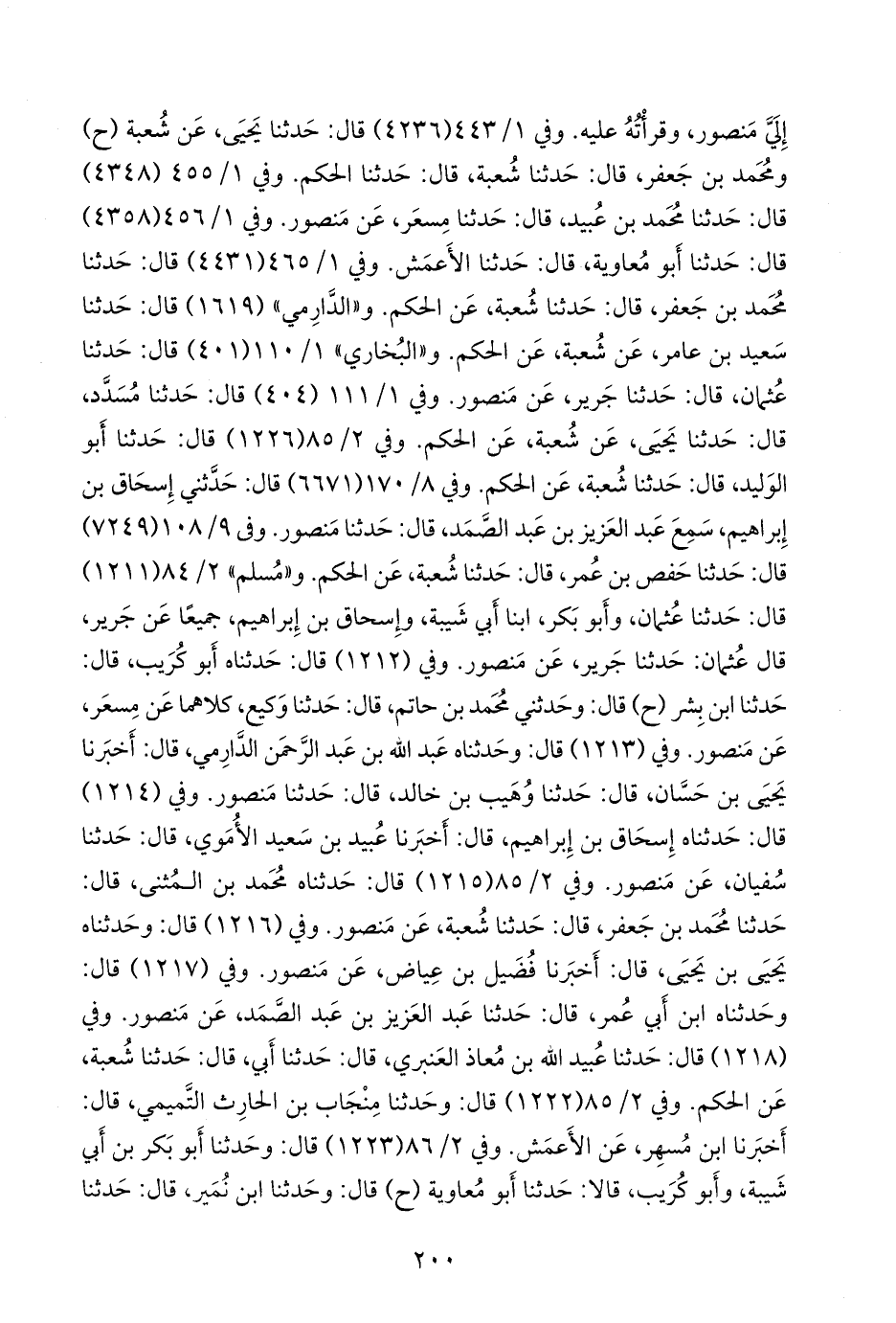 وفي (١٢١٢) قال: حدثناه أَبو كُريب، قال: حدثنا ابن بشر (ح) قال: وحدثني محمد بن حاتم، قال: حدثنا وكيع، كلاهما عن مِسعَر، عن منصور. وفي (١٢١٣) قال: وحدثناه عبد الله بن عبد الرَّحمَن الدَّارِمي، قال: أخبرنا يحيى بن حسان، قال: حدثنا وهيب بن خالد، قال: حدثنا منصور. وفي (١٢١٤) قال: حدثناه إسحاق بن إبراهيم، قال: أخبرنا عبيد بن سعيد الأُمَوي، قال: حدثنا سفيان، عن منصور. وفي ٢/ ٨٥ (١٢١٥) قال: حدثناه محمد بن المثنى، قال: حدثنا محمد بن جعفر، قال: حدثنا شعبة، عن منصور. وفي (١٢١٦) قال: وحدثناه يحيى بن يحيى، قال: أخبرنا فُضيل بن عِياض، عن منصور. وفي (١٢١٧) قال: وحدثناه ابن أبي عمر، قال: حدثنا عبد العزيز بن عبد الصمد، عن منصور. وفي (١٢١٨) قال: حدثنا عُبيد الله بن معاذ العنبري، قال: حدثنا أبي، قال: حدثنا شعبة، عن الحكم. وفي ٢/ ٨٥ (١٢٢٢) قال: وحدثنا منجاب بن الحارث التميمي، قال: أخبرنا ابن مُسهِر، عن الأعمش. وفي ٢/ ٨٦ (١٢٢٣) قال: وحدثنا أَبو بكر بن أبي شيبة، وأَبو كُريب، قالا: حدثنا أَبو معاوية (ح) قال: وحدثنا ابن نُمير، قال: حدثنا