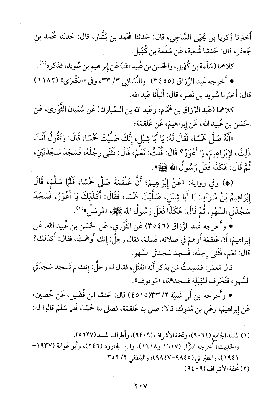 - وفي رواية: «عن إبراهيم؛ أن علقمة صلى خمسا، فلما سلم، قال إبراهيم بن سويد: يا أبا شبل، صليت خمسا، فقال: أكذلك يا أعور، فسجد سجدتي السهو، ثم قال: هكذا فعل رسول الله صَلى الله عَليه وسَلم «مُرسَل» (¬١).
