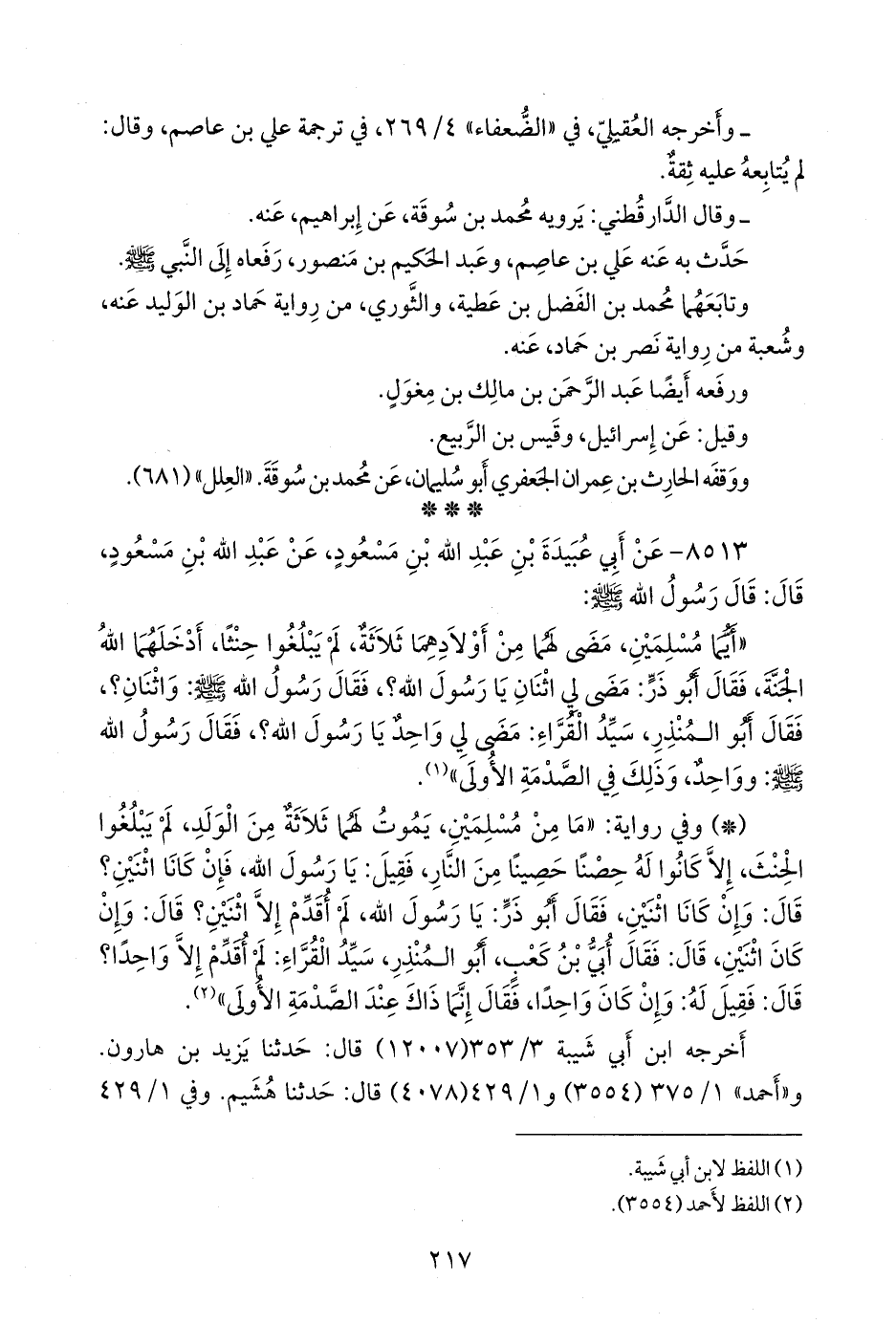 «أيما مسلمين، مضى لهما من أولادهما ثلاثة، لم يبلغوا حنثا، إلا أدخلهما الله الجنة، فقال أَبو ذر: مضى لي اثنان يا رسول الله؟، فقال رسول الله صَلى الله عَليه وسَلم: واثنان؟، فقال أَبو المنذر، سيد القراء: مضى لي واحد يا رسول الله؟، فقال رسول الله صَلى الله عَليه وسَلم: وواحد، وذلك في الصدمة الأولى» (¬١).