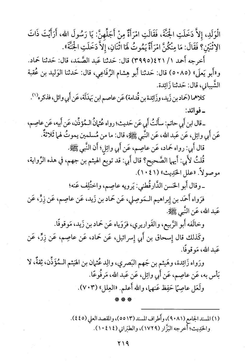 - قال عبد الرَّحمَن بن أبي حاتم الرازي: سألتُ أبي عن حديثٍ؛ رواه عثمان المؤذن، عن أبيه، عن عاصم، عن أبي وائل، عن عبد الله، عن النبي صَلى الله عَليه وسَلم قال: ما من مُسلِمَيْن يموت لهما ثلاثة.