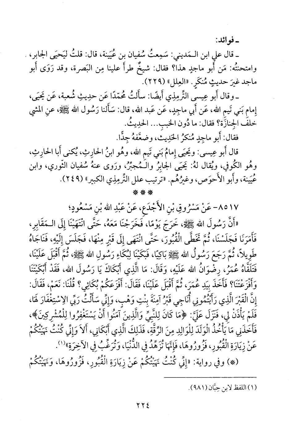 - وقال أَبو عيسى التِّرمِذي: سألتُ محمدًا عن حديث شعبة، عن يحيى، إمام بني تيم الله, عن أبي ماجد، عن عبد الله، قال: سألنا رسول الله صَلى الله عَليه وسَلم عن المشي خلف الجِنازة؟ فقال: ما دون الخبب، الحديثَ.