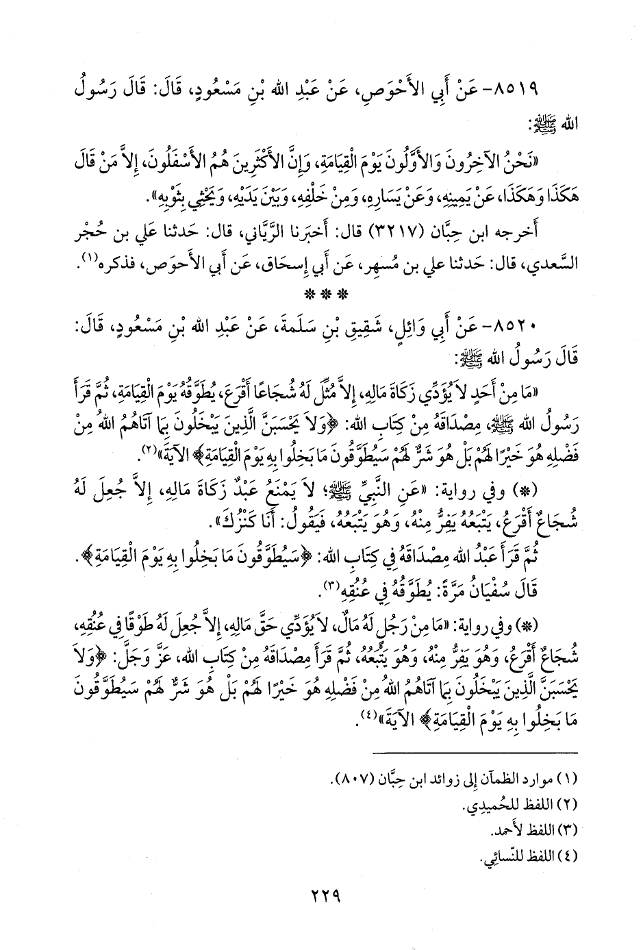 - وفي رواية: «ما من رجل له مال، لا يؤدي حق ماله، إلا جعل له طوقا في عنقه، شجاع أقرع، وهو يفر منه، وهو يتبعه، ثم قرأ مصداقه من كتاب الله، عز وجل: {ولا يحسبن الذين يبخلون بما آتاهم الله من فضله هو خيرًا لهم بل هو شر لهم سيطوقون ما بخلوا به يوم القيامة} الآية» (¬٣).