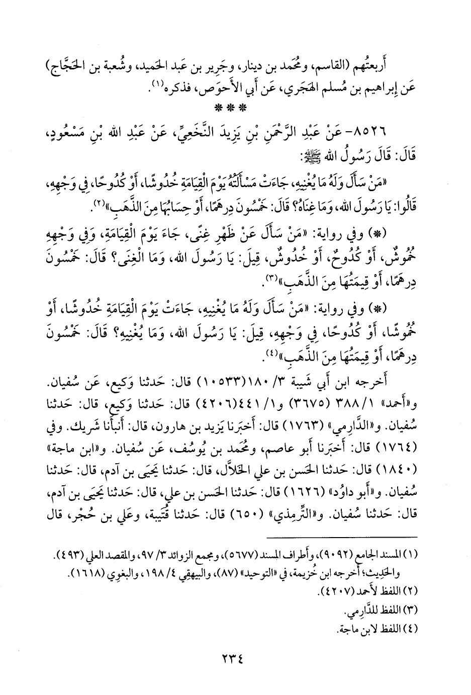 - وفي رواية: «من سأل وله ما يغنيه، جاءت يوم القيامة خدوشا، أو خموشا، أو كدوحا، في وجهه، قيل: يا رسول الله، وما يغنيه؟ قال: خمسون درهما، أو قيمتها من الذهب» (¬٣).