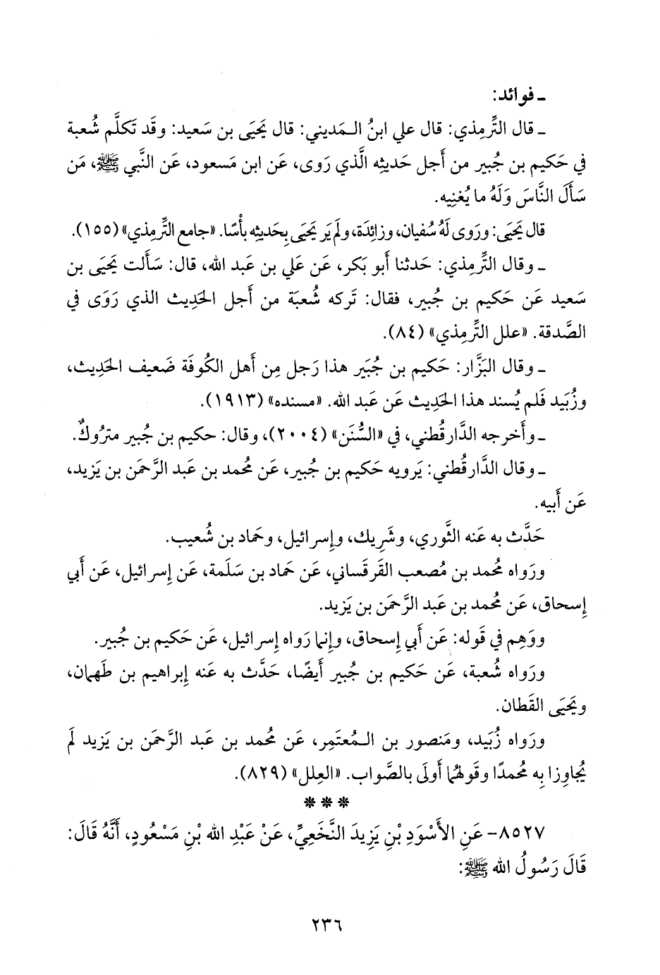 - وقال التِّرمِذي: قال علي بن المديني: قال يحيى بن سعيد: وقد تكلم شعبة في حكيم بن جبير من أجل حديثه الذي روى، عن ابن مسعود، عن النبي صَلى الله عَليه وسَلم من سأل الناس وله ما يغنيه.