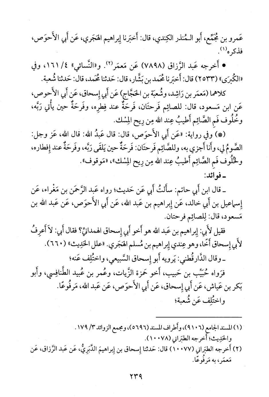 كلاهما (مَعمَر بن راشد، وشعبة بن الحجاج) عن أبي إسحاق، عن أبي الأحوص، عن ابن مسعود، قال: للصائم فرحتان، فرحة عند فطره، وفرحة حين يأتي ربه، وخلوف فم الصائم أطيب عند الله من ريح المسك.