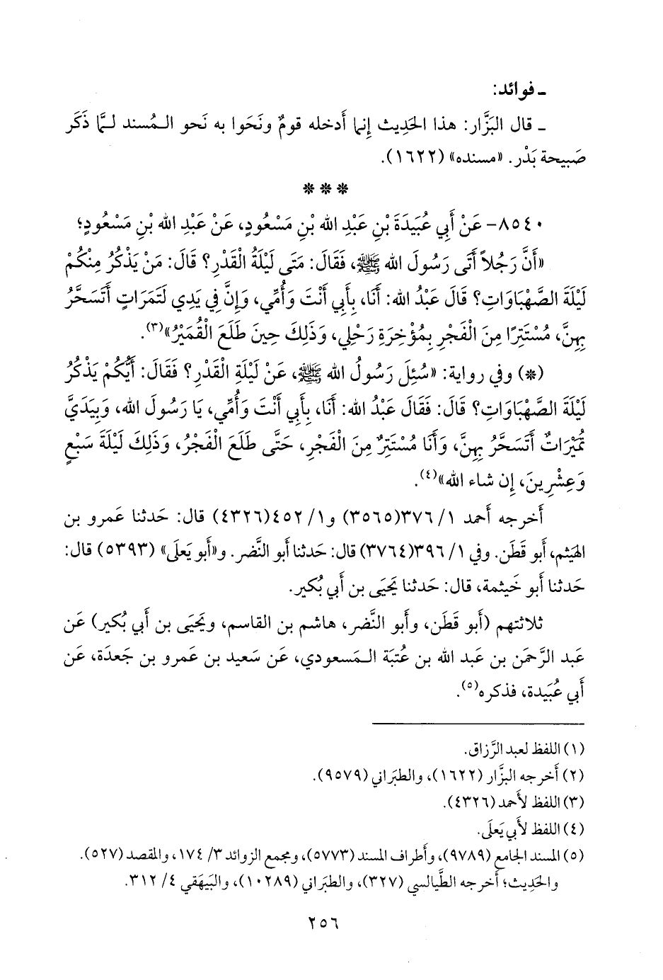 - وفي رواية: «سئل رسول الله صَلى الله عَليه وسَلم عن ليلة القدر؟ فقال: أيكم يذكر ليلة الصهباوات؟ قال: فقال عبد الله: أنا، بأبي أنت وأمي، يا رسول الله، وبيدي تميرات أتسحر بهن، وأنا مستتر من الفجر، حتى طلع الفجر، وذلك ليلة سبع وعشرين، إن شاء الله» (¬٢).