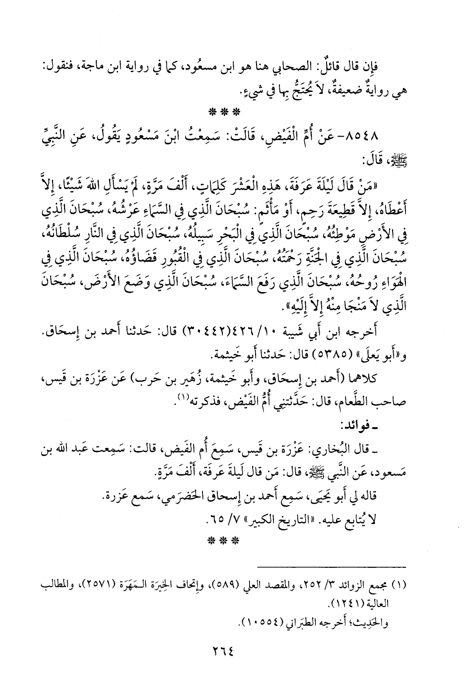 - قلنا: إِسناده ضعيفٌ؛ قال البخاري: عَزرة بن قيس، سمع أم الفيض، قالت: سمعت عبد الله بن مسعود، عن النبي صَلى الله عَليه وسَلم قال: من قال ليلة عرفة، ألف مرة.