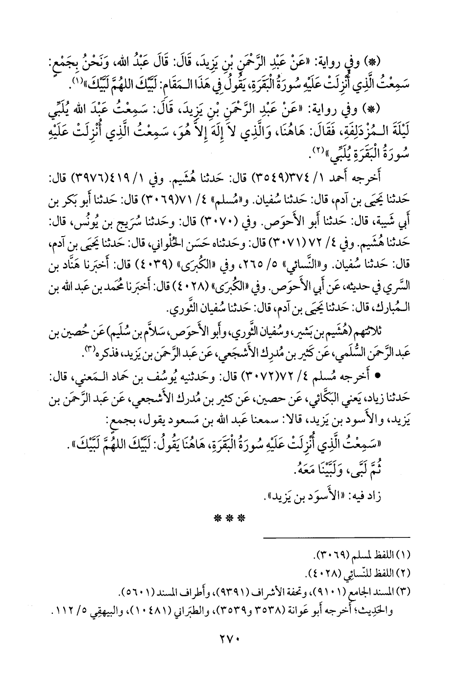 ثلاثتهم (هُشيم بن بشير، وسفيان الثوري، وأَبو الأحوص سَلَّام بن سليم) عن حصين بن عبد الرَّحمَن السلمي، عن كثير بن مدرك الأشجعي، عن عبد الرَّحمَن بن يزيد، فذكره (¬١).