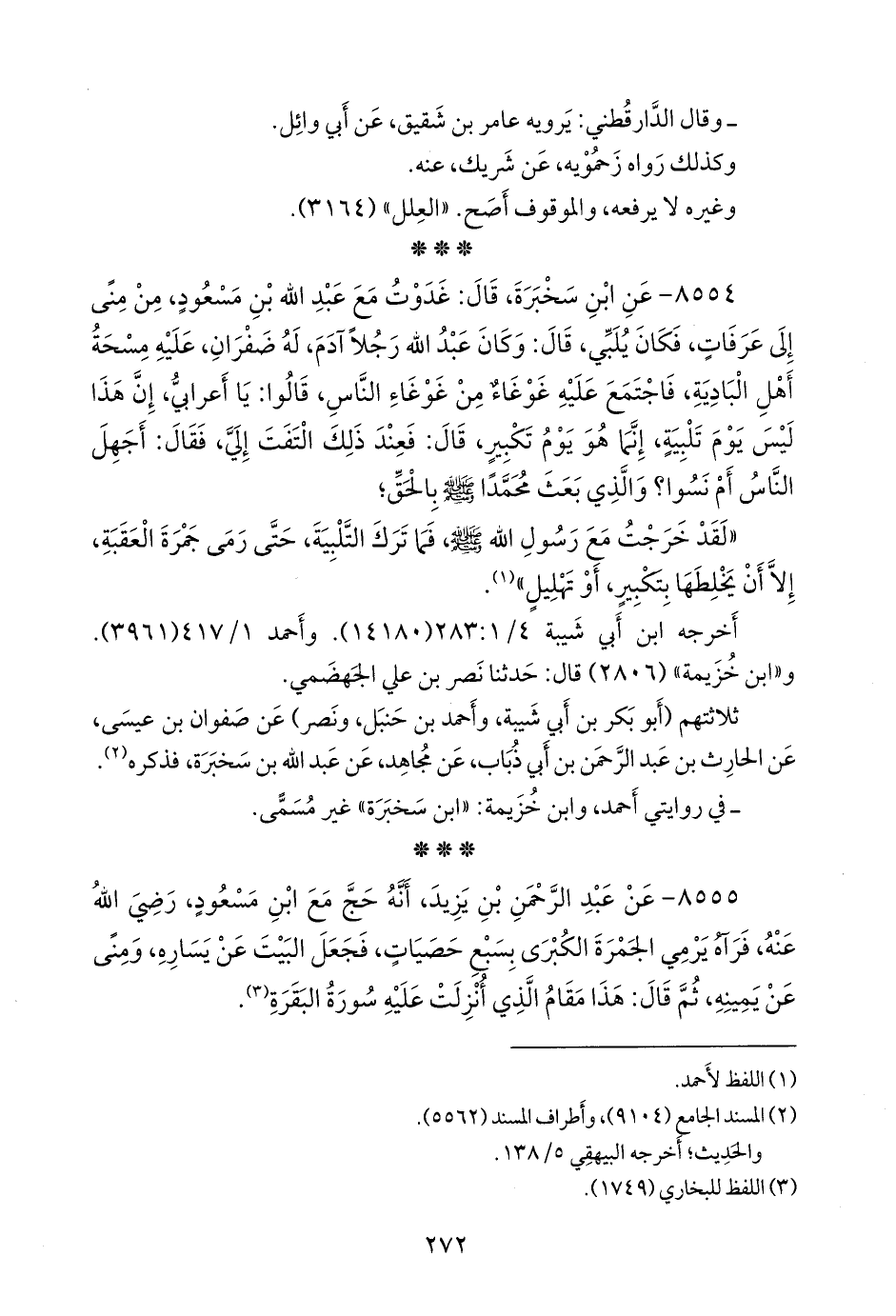 ٨٥٥٤ - عن ابن سخبرة، قال: غدوت مع عبد الله بن مسعود، من منى إلى عرفات، فكان يلبي، قال: وكان عبد الله رجلا آدم، له ضفران، عليه مسحة أهل البادية، فاجتمع عليه غوغاء من غوغاء الناس، قالوا: يا أعرابي، إن هذا ليس يوم تلبية، إنما هو يوم تكبير، قال: فعند ذلك التفت إلي، فقال: أجهل الناس أم نسوا؟ والذي بعث محمدا صَلى الله عَليه وسَلم بالحق؛