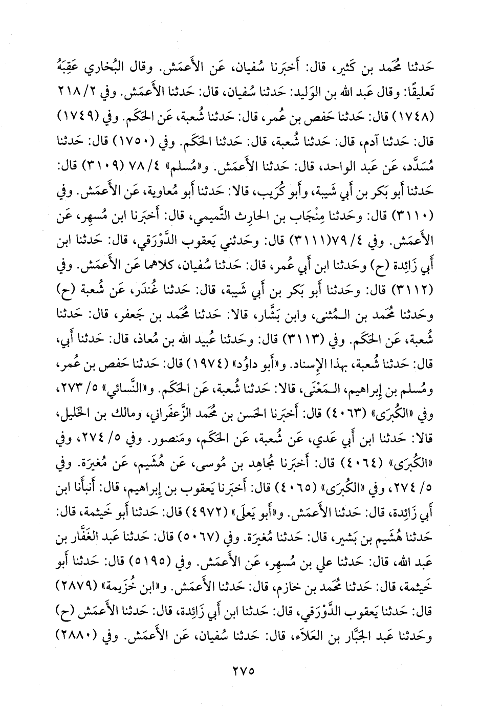 قال: حدثنا محمد بن بشار، قال: حدثنا محمد بن جعفر، قال: حدثنا شعبة، عن الحكم (ح) وحدثنا الزعفراني، قال: حدثنا محمد بن أَبي عَدي، عن شعبة، عن الحكم، ومنصور. و «ابن حِبَّان» (٣٨٧٠) قال: أخبرنا أَبو خليفة، قال: حدثنا محمد بن كثير، قال: أخبرنا سفيان، عن الأعمش. وفي (٣٨٧٣) قال: أخبرنا أحمد بن علي بن المثنى، قال: حدثنا عبد الغفار بن عبد الله، قال: حدثنا علي بن مُسهِر، عن الأعمش. خمستهم (سليمان الأعمش، والحكم بن عتيبة، ومغيرة بن مِقسَم، وحماد بن أبي سليمان، ومنصور بن المُعتَمِر) عن إبراهيم بن يزيد النَّخَعي.