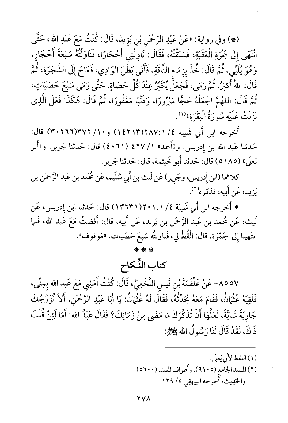 - أَخرجه ابن أبي شيبة (١٣٦٣١) قال: حدثنا ابن إدريس، عن ليث، عن محمد بن عبد الرَّحمَن بن يزيد، عن أبيه، قال: أفضت مع عبد الله، فلما انتهينا إلى الجمرة، قال: القط لي، فناولته سبع حصيات. «موقوف».