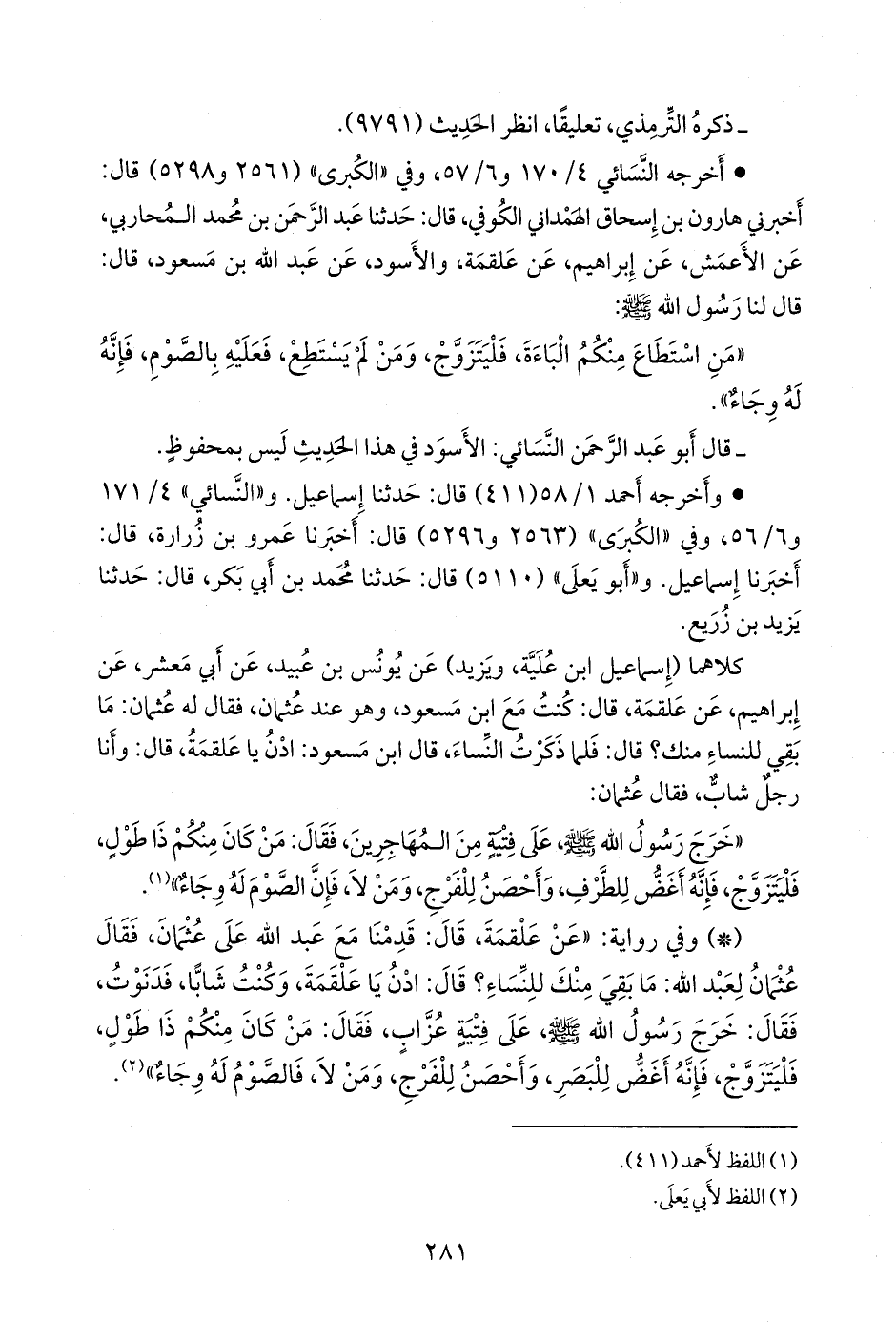 - وفي رواية: «عن علقمة، قال: قدمنا مع عبد الله على عثمان، فقال عثمان لعبد الله: ما بقي منك للنساء؟ قال: ادن يا علقمة، وكنت شابا، فدنوت، فقال: خرج رسول الله صَلى الله عَليه وسَلم على فتية عزاب، فقال: من كان منكم ذا طول، فليتزوج، فإنه أغض للبصر، وأحصن للفرج، ومن لا، فالصوم له وجاء» (¬٣).