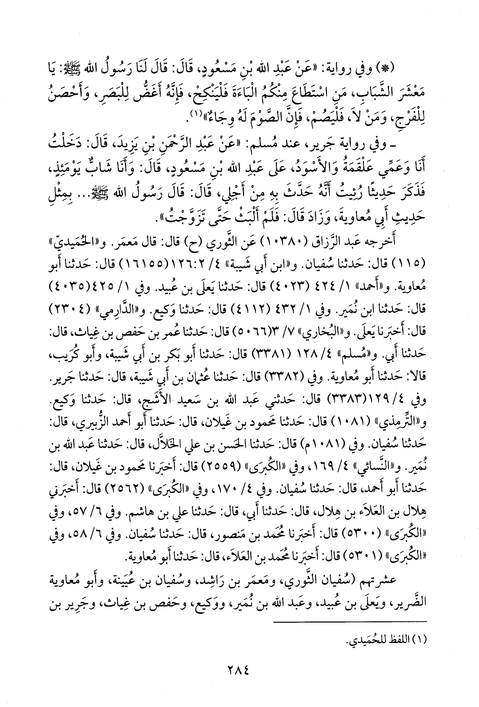 أخرجه عبد الرزاق (١٠٣٨٠) عن الثوري (ح) قال: قال معمر. و «الحميدي» (١١٥) قال: حدثنا سفيان. و «ابن أبي شيبة» (١٦١٥٥) قال: حدثنا أَبو معاوية. و «أحمد» (٤٠٢٣) قال: حدثنا يَعلى بن عبيد. وفي ١/ ٤٢٥ (٤٠٣٥) قال: حدثنا ابن نُمير. وفي ١/ ٤٣٢ (٤١١٢) قال: حدثنا وكيع. و «الدَّارِمي» (٢٣٠٤) قال: أخبرنا يَعلى. و «البخاري» ٧/ ٣ (٥٠٦٦) قال: حدثنا عمر بن حفص بن غياث، قال: حدثنا أبي. و «مسلم» ٤/ ١٢٨ (٣٣٨١) قال: حدثنا أَبو بكر بن أبي شيبة، وأَبو كُريب، قالا: حدثنا أَبو معاوية. وفي (٣٣٨٢) قال: حدثنا عثمان بن أبي شيبة، قال: حدثنا جَرير. وفي ٤/ ١٢٩ (٣٣٨٣) قال: حدثني عبد الله بن سعيد الأشج، قال: حدثنا وكيع. و «التِّرمِذي» (١٠٨١) قال: حدثنا محمود بن غَيلان، قال: حدثنا أَبو أحمد الزُّبَيري، قال: حدثنا سفيان. وفي (١٠٨١ م) قال: حدثنا الحسن بن علي الخَلَّال، قال: حدثنا عبد الله بن نُمير. و «النَّسَائي» ٤/ ١٦٩، وفي «الكبرى» (٢٥٥٩) قال: أخبرنا محمود بن غَيلان، قال: حدثنا أَبو أحمد، قال: حدثنا سفيان. وفي ٤/ ١٧٠، وفي «الكبرى» (٢٥٦٢) قال: أخبرني هلال بن العلاء بن هلال، قال: حدثنا أبي، قال: حدثنا علي بن هاشم. وفي ٦/ ٥٧، وفي «الكبرى» (٥٣٠٠) قال: أخبرنا محمد بن منصور، قال: حدثنا سفيان. وفي ٦/ ٥٨، وفي «الكبرى» (٥٣٠١) قال: أخبرنا محمد بن العلاء، قال: حدثنا أَبو معاوية.