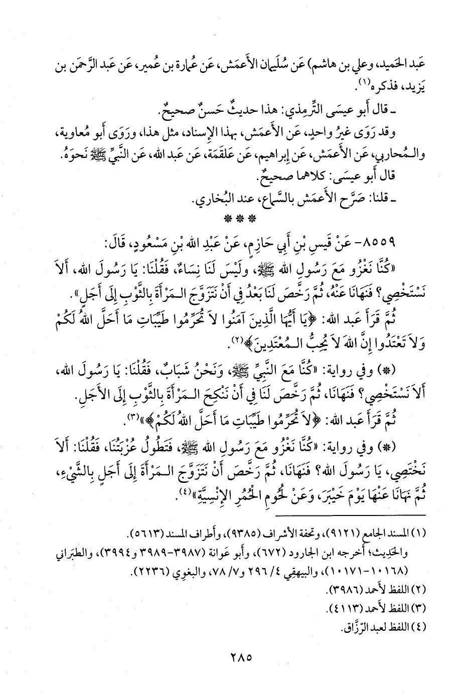 «كنا نغزو مع رسول الله صَلى الله عَليه وسَلم وليس لنا نساء، فقلنا: يا رسول الله، ألا نستخصي؟ فنهانا عنه، ثم رخص لنا بعد في أن نتزوج المرأة بالثوب إلى أجل».