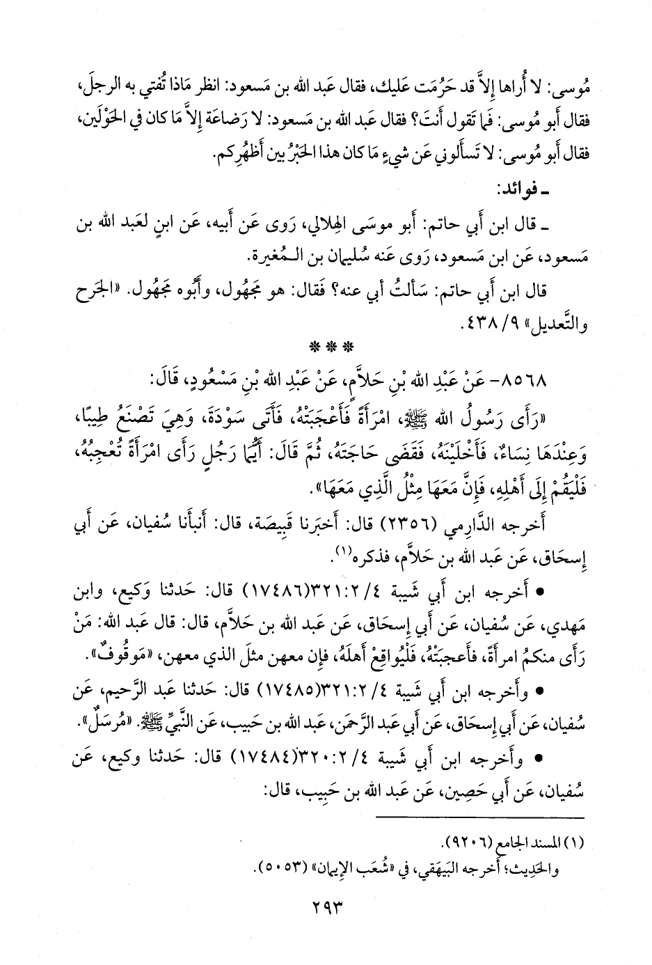 - أَخرجه ابن أبي شيبة (١٧٤٨٦) قال: حدثنا وكيع، وابن مهدي، عن سفيان، عن أبي إسحاق، عن عبد الله بن حلام، قال: قال عبد الله: من رأى منكم امرأة، فأعجبته، فليواقع أهله، فإن معهن مثل الذي معهن، «موقوف».