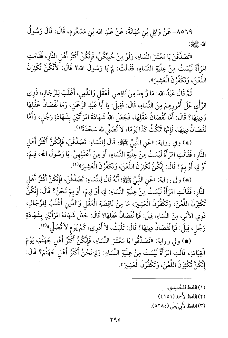 - وفي رواية: «عن النبي صَلى الله عَليه وسَلم؛ أنه قال للنساء: تصدقن، فإنكن أكثر أهل النار، فقالت امرأة ليست من علية النساء: لم، أو فيم، أو بم نحن؟ قال: إنكن تكثرن اللعن، وتكفرن العشير، ما من ناقصة العقل والدين أغلب للرجال، ذوي الأمر، من النساء، قيل: فما نقصان عقلها؟ قال: جعل شهادة امرأتين بشهادة رجل، قيل: فما نقصان دينها؟ قال: تلبث، لا أدري، كم يوم لا تصلي» (¬٣).