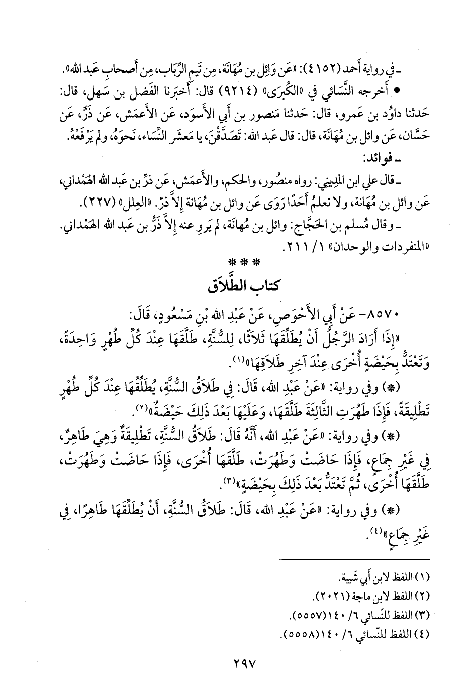 - وفي رواية: «عن ابن مسعود، قال: من أراد أن يطلق للسنة، كما أمر الله، فليطلقها طاهرا من غير جماع» (¬٥).