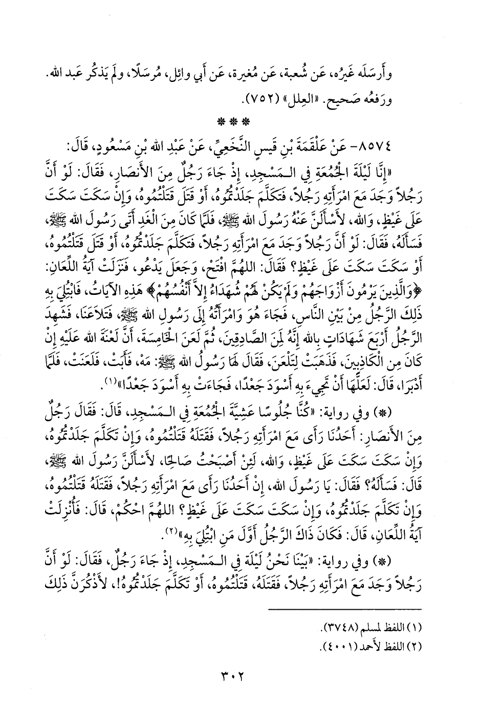 - وفي رواية: «بينا نحن ليلة في المسجد، إذ جاء رجل، فقال: لو أن رجلا وجد مع امرأته رجلا، فقتله، قتلتموه، أو تكلم جلدتموه!، لأذكرن ذلك