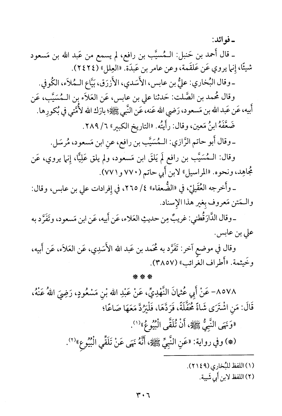 - قال أحمد بن حنبل: المُسَيَّب بن رافع، لم يسمع من عبد الله بن مسعود شيئا، إنما يروي عن علقمة، وعن عامر بن عَبدة. «العلل» (٢٤٢٤).