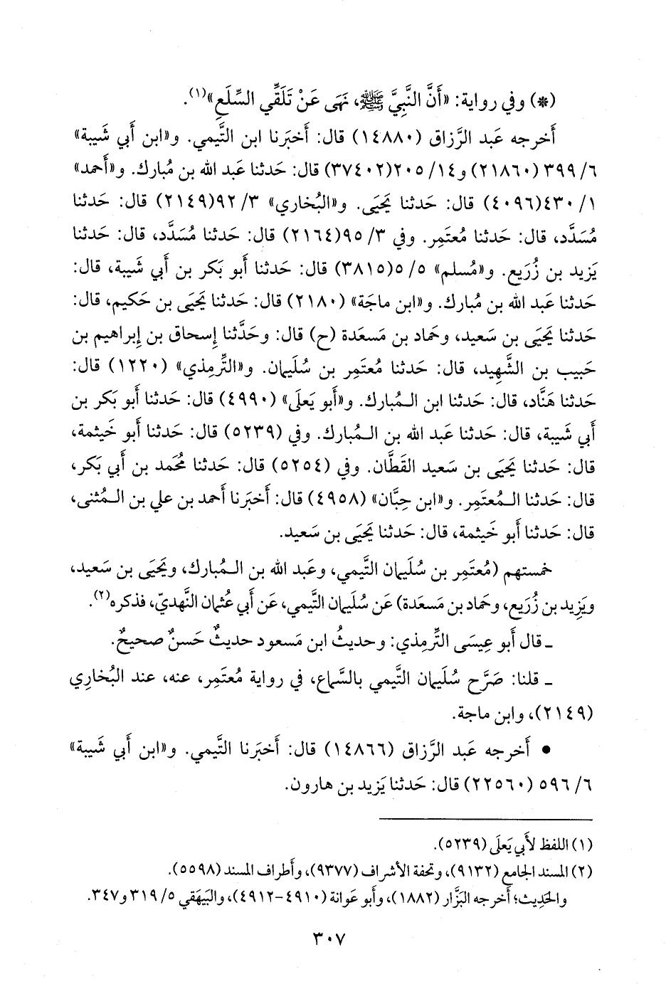 و «التِّرمِذي» (١٢٢٠) قال: حدثنا هَنَّاد، قال: حدثنا ابن المبارك. و «أَبو يَعلى» (٤٩٩٠) قال: حدثنا أَبو بكر بن أبي شيبة، قال: حدثنا عبد الله بن المبارك. وفي (٥٢٣٩) قال: حدثنا أَبو خيثمة، قال: حدثنا يحيى بن سعيد القطان. وفي (٥٢٥٤) قال: حدثنا محمد بن أَبي بكر، قال: حدثنا المُعتَمِر. و «ابن حِبَّان» (٤٩٥٨) قال: أخبرنا أحمد بن علي بن المثنى، قال: حدثنا أَبو خيثمة، قال: حدثنا يحيى بن سعيد.