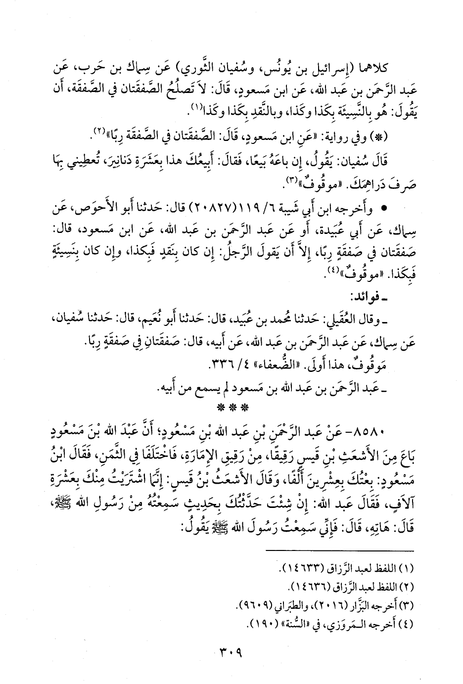 - وفي رواية: «عن ابن مسعود، قال: الصفقتان في الصفقة ربا» (¬٢).