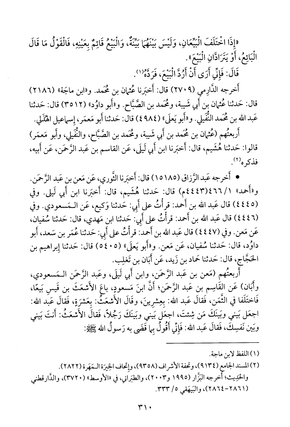 أربعتهم (معن بن عبد الرَّحمَن، وابن أبي ليلى، وعبد الرَّحمَن المَسعودي، وأبان) عن القاسم بن عبد الرَّحمَن؛ أن ابن مسعود، باع الأشعث بن قيس بيعا، فاختلفا في الثمن، فقال عبد الله: بعشرين، وقال الأشعث: بعشرة، فقال عبد الله: اجعل بيني وبينك من شئت، اجعل بيني وبينك رجلا، فقال الأشعث: أنت بيني وبين نفسك، فقال عبد الله: فإني أقول بما قضى به رسول الله صَلى الله عَليه وسَلم: