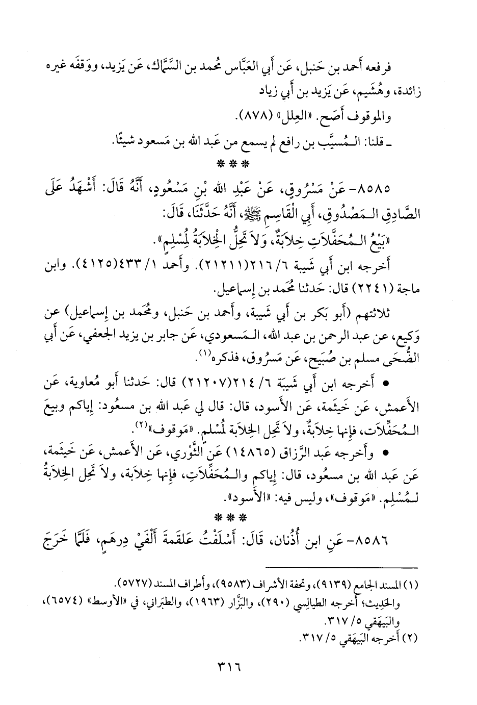 ثلاثتهم (أَبو بكر بن أبي شيبة، وأحمد بن حنبل، ومحمد بن إسماعيل) عن وكيع بن الجراح، عن عبد الرَّحمَن بن عبد الله، المَسعودي، عن جابر بن يزيد الجعفي، عن أبي الضحى مسلم بن صُبَيح، عن مسروق، فذكره (¬١).