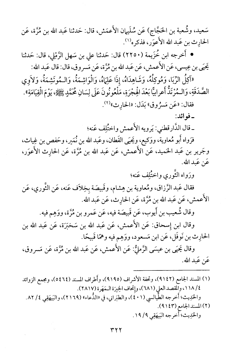 فرواه أَبو معاوية، ووكيع، ويحيى القطان، وعبد الله بن نُمير، وحفص بن غياث، وجرير بن عبد الحميد، عن الأعمش، عن عبد الله بن مُرَّة، عن الحارث الأعور، عن عبد الله.