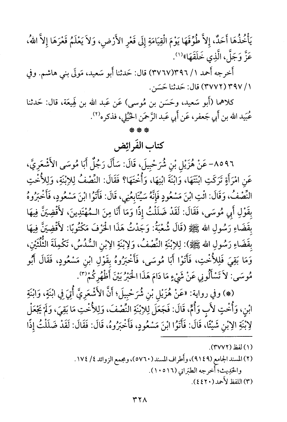 ٨٥٩٦ - عن هزيل بن شرحبيل، قال: سأل رجل أبا موسى الأشعري، عن امرأة تركت ابنتها، وابنة ابنها، وأختها؟ فقال: النصف للابنة، وللأخت النصف، وقال: ائت ابن مسعود فإنه سيتابعني، قال: فأتوا ابن مسعود، فأخبروه بقول أبي موسى، فقال: لقد ضللت إذا وما أنا من المهتدين، لأقضين فيها بقضاء رسول الله صَلى الله عَليه وسَلم (قال شعبة: وجدت هذا الحرف مكتوبا: لأقضين فيها بقضاء رسول الله صَلى الله عَليه وسَلم): للابنة النصف، ولابنة الابن السدس، تكملة الثلثين، وما بقي فللأخت، فأتوا أبا موسى، فأخبروه بقول ابن مسعود، فقال أَبو موسى: لا تسألوني عن شيء ما دام هذا الحبر بين أظهركم (¬١).