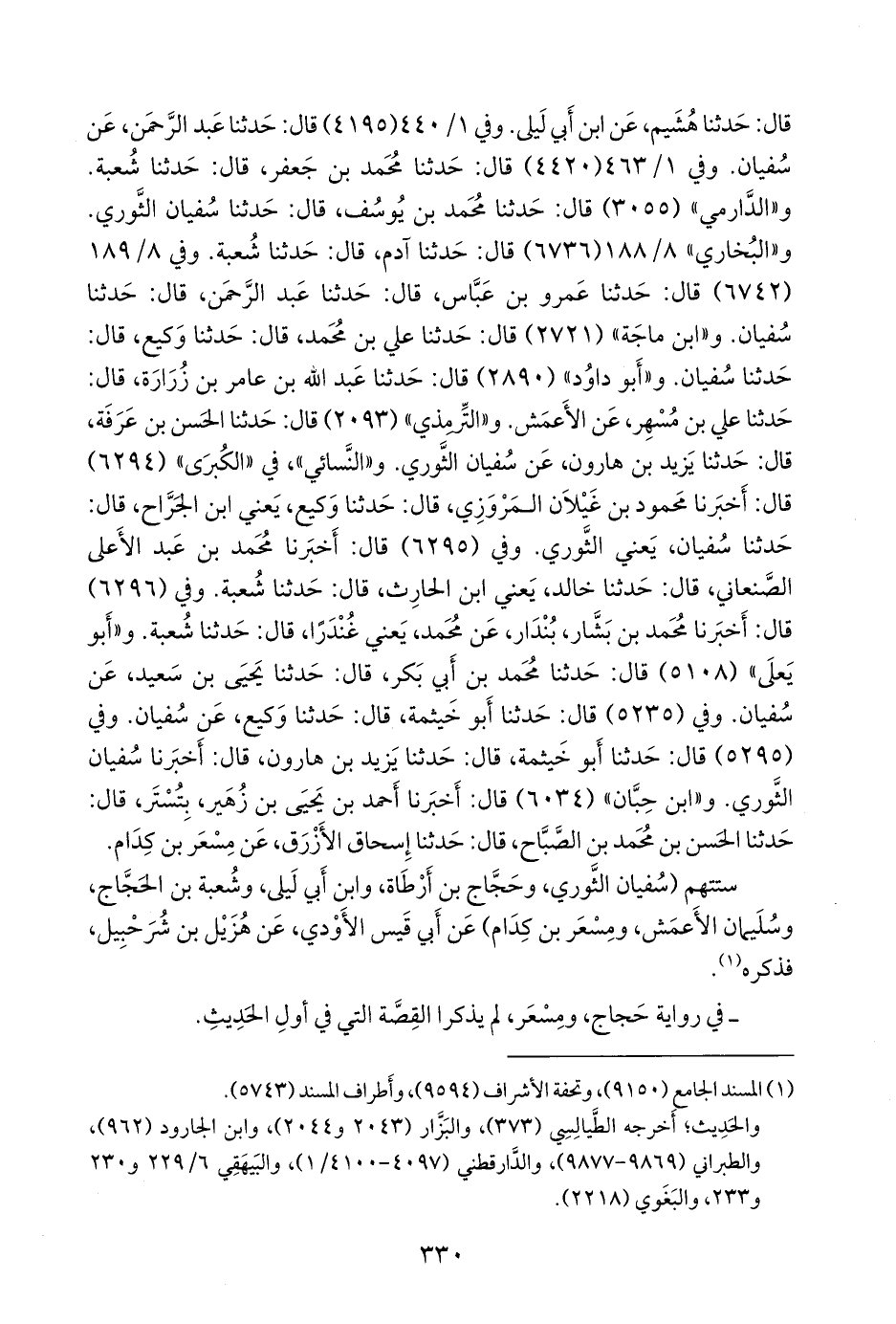 و «أَبو داود» (٢٨٩٠) قال: حدثنا عبد الله بن عامر بن زُرارة، قال: حدثنا علي بن مُسهِر، عن الأعمش. و «التِّرمِذي» (٢٠٩٣) قال: حدثنا الحسن بن عرفة، قال: حدثنا يزيد بن هارون، عن سفيان الثوري. و «النَّسَائي» في «الكبرى» (٦٢٩٤) قال: أخبرنا محمود بن غَيلان المَرْوَزي، قال: حدثنا وكيع، يعني ابن الجراح، قال: حدثنا سفيان، يعني الثوري. وفي (٦٢٩٥) قال: أخبرنا محمد بن عبد الأعلى الصَّنْعاني، قال: حدثنا خالد، يعني ابن الحارث، قال: حدثنا شعبة. وفي (٦٢٩٦) قال: أخبرنا محمد بن بشار، بُندَار، عن محمد، يعني غُندَرا، قال: حدثنا شعبة. و «أَبو يَعلى» (٥١٠٨) قال: حدثنا محمد بن أَبي بكر، قال: حدثنا يحيى بن سعيد، عن سفيان. وفي (٥٢٣٥) قال: حدثنا أَبو خيثمة، قال: حدثنا وكيع، عن سفيان. وفي (٥٢٩٥) قال: حدثنا أَبو خيثمة، قال: حدثنا يزيد بن هارون، قال: أخبرنا سفيان الثوري. و «ابن حِبَّان» (٦٠٣٤) قال: أخبرنا أحمد بن يحيى بن زهير، بتستر، قال: حدثنا الحسن بن محمد بن الصباح، قال: حدثنا إسحاق الأزرق، عن مِسعَر بن كِدَام.