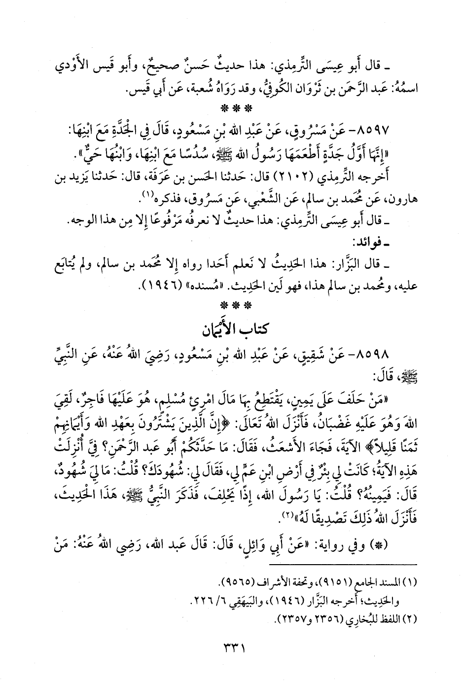 «من حلف على يمين، يقتطع بها مال امرئ مسلم، هو عليها فاجر، لقي الله وهو عليه غضبان، فأنزل الله تعالى: {إن الذين يشترون بعهد الله وأيمانهم ثمنا قليلا} الآية، فجاء الأشعث، فقال: ما حدثكم أَبو عبد الرَّحمَن؟ في أنزلت هذه الآية؛ كانت لي بئر في أرض ابن عم لي، فقال لي: شهودك؟ قلت: ما لي شهود، قال: فيمينه؟ قلت: يا رسول الله، إذا يحلف، فذكر النبي صَلى الله عَليه وسَلم هذا الحديث، فأنزل الله ذلك تصديقا له» (¬١).