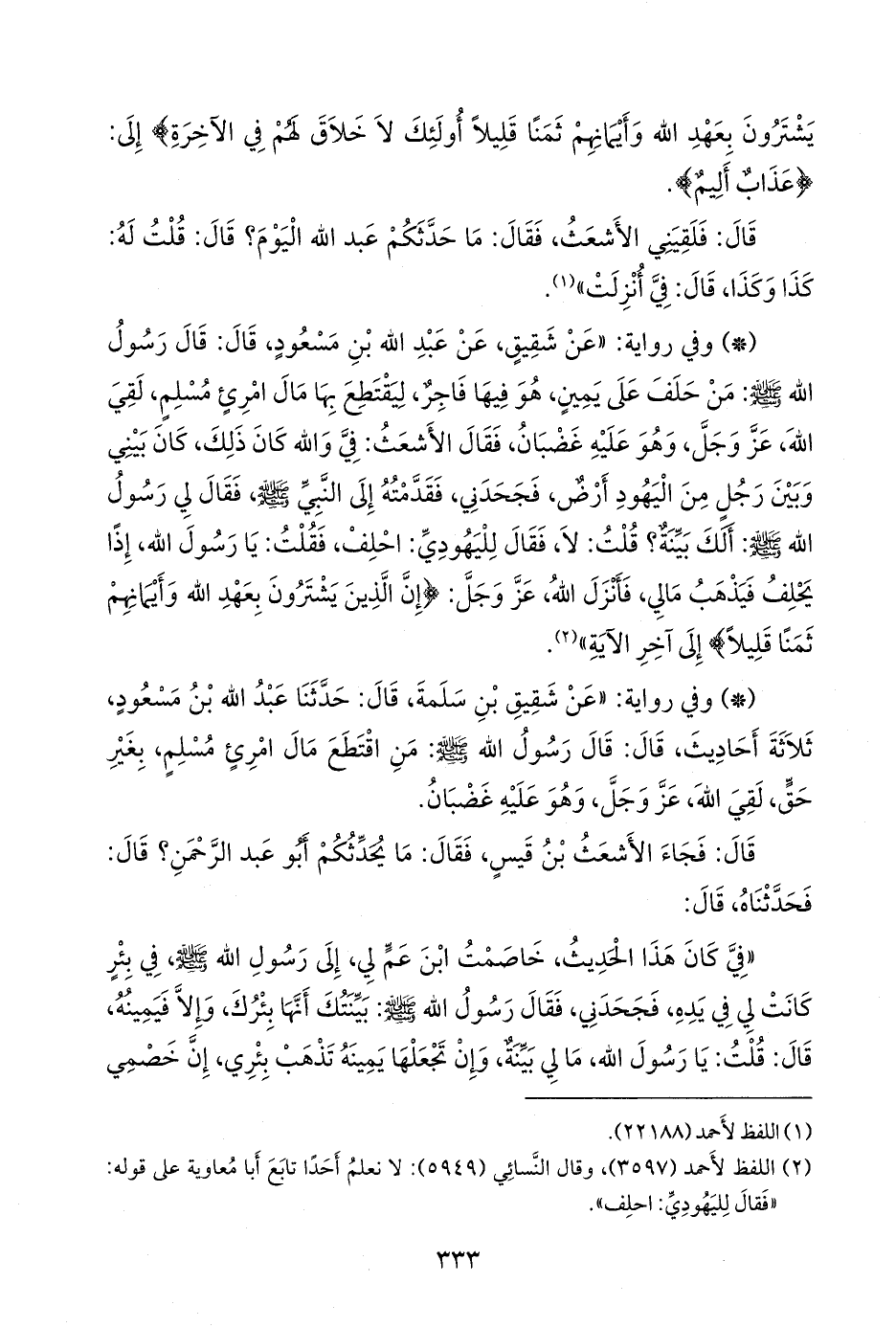 - وفي رواية: «عن شقيق، عن عبد الله بن مسعود، قال: قال رسول الله صَلى الله عَليه وسَلم: من حلف على يمين، هو فيها فاجر، ليقتطع بها مال امرئ مسلم، لقي الله، عز وجل، وهو عليه غضبان، فقال الأشعث: في والله كان ذلك، كان بيني وبين رجل من اليهود أرض، فجحدني، فقدمته إلى النبي صَلى الله عَليه وسَلم فقال لي رسول الله صَلى الله عَليه وسَلم: ألك بينة؟ قلت: لا، فقال لليهودي: احلف، فقلت: يا رسول الله، إذا يحلف فيذهب مالي، فأنزل الله، عز وجل: {إن الذين يشترون بعهد الله وأيمانهم ثمنا قليلا} إلى آخر الآية» (¬١).