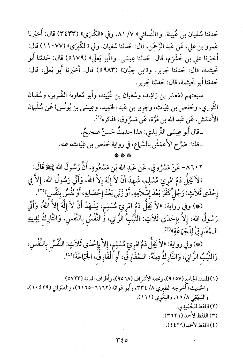 - وفي رواية: «لا يحل دم امرئ مسلم، يشهد أن لا إله إلا الله، وأني رسول الله، إلا بإحدى ثلاث: الثيب الزاني، والنفس بالنفس، والتارك لدينه المفارق للجماعة» (¬٢).
