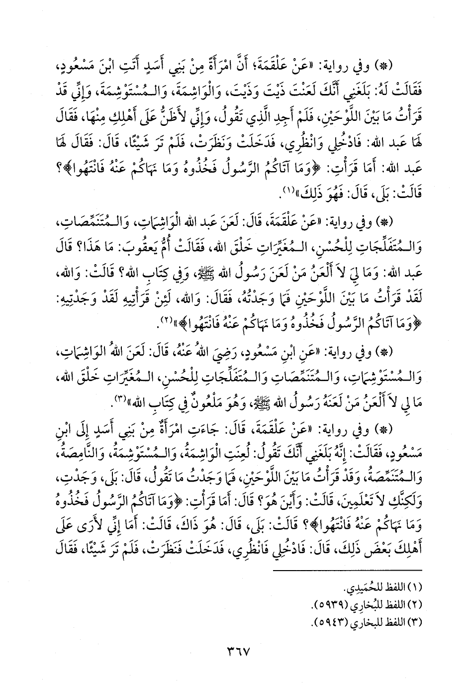 - وفي رواية: «عن علقمة، قال: جاءت امرأة من بني أسد إلى ابن مسعود، فقالت: إنه بلغني أنك تقول: لعنت الواشمة، والمستوشمة، والنامصة، والمتنمصة، وقد قرأت ما بين اللوحين، فما وجدت ما تقول، قال: بلى، وجدت، ولكنك لا تعلمين، قالت: وأين هو؟ قال: أما قرأت: {وما آتاكم الرسول فخذوه وما نهاكم عنه فانتهوا}؟ قالت: بلى، قال: هو ذاك، قالت: أما إني لأرى على أهلك بعض ذلك، قال: فادخلي فانظري، فدخلت فنظرت، فلم تر شيئا، فقال