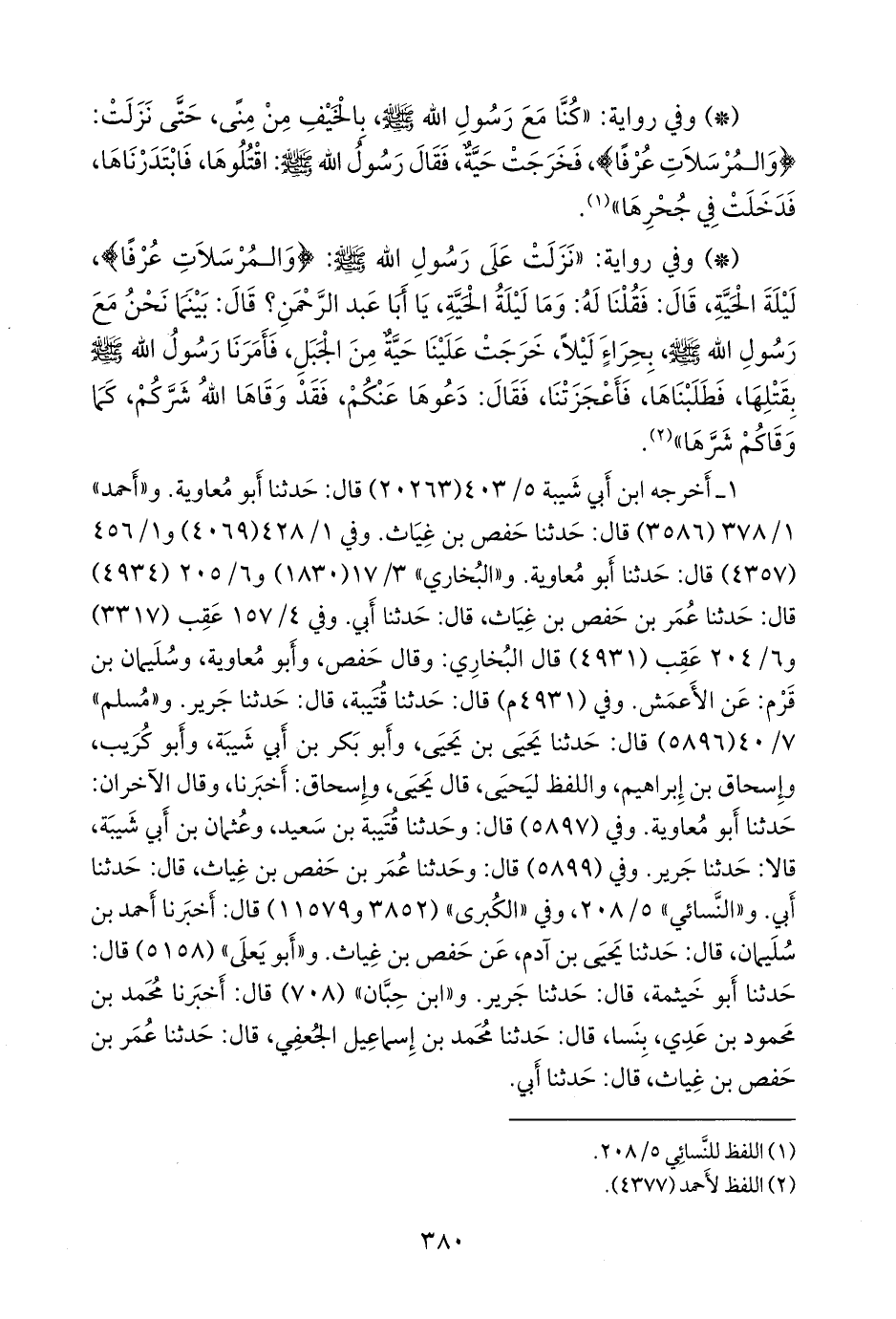 - وفي رواية: «نزلت على رسول الله صَلى الله عَليه وسَلم: {والمرسلات عرفا}، ليلة الحية، قال: فقلنا له: وما ليلة الحية، يا أبا عبد الرَّحمَن؟ قال: بينما نحن مع رسول الله صَلى الله عَليه وسَلم بحراء ليلا، خرجت علينا حية من الجبل، فأمرنا رسول الله صَلى الله عَليه وسَلم بقتلها، فطلبناها، فأعجزتنا، فقال: دعوها عنكم، فقد وقاها الله شركم، كما وقاكم شرها» (¬١).