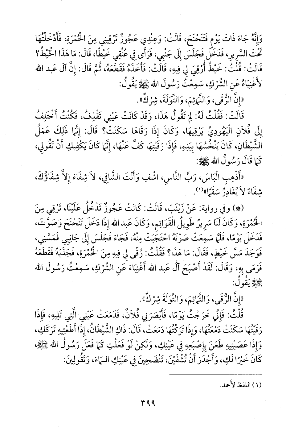 - وفي رواية: عن زينب، قالت: كانت عجوز تدخل علينا، ترقي من الحمرة، وكان لنا سرير طويل القوائم، وكان عبد الله إذا دخل تنحنح وصوت، فدخل يوما، فلما سمعت صوته احتجبت منه، فجاء فجلس إلى جانبي فمسني، فوجد مس خيط، فقال: ما هذا؟ فقلت: رُقي لي فيه من الحمرة، فجذبه فقطعه فرمى به، وقال: لقد أصبح آل عبد الله أغنياء عن الشرك، سمعت رسول الله صَلى الله عَليه وسَلم يقول: