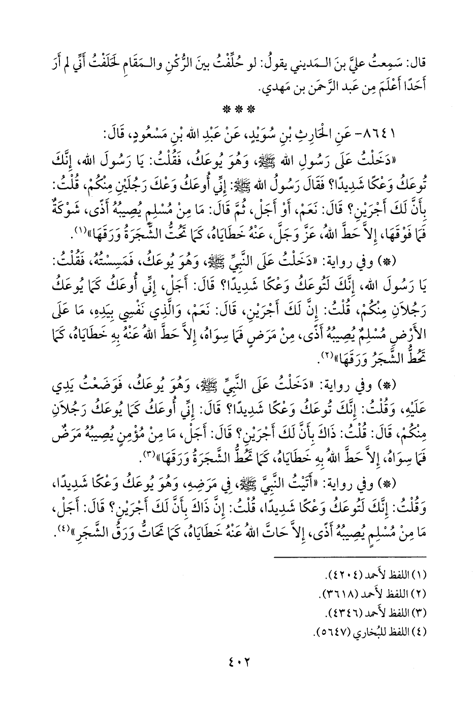 - وفي رواية: «أتيت النبي صَلى الله عَليه وسَلم في مرضه، وهو يوعك وعكا شديدا، وقلت: إنك لتوعك وعكا شديدا، قلت: إن ذاك بأن لك أجرين؟ قال: أجل، ما من مسلم يصيبه أذى، إلا حات الله عنه خطاياه، كما تحات ورق الشجر» (¬٤).