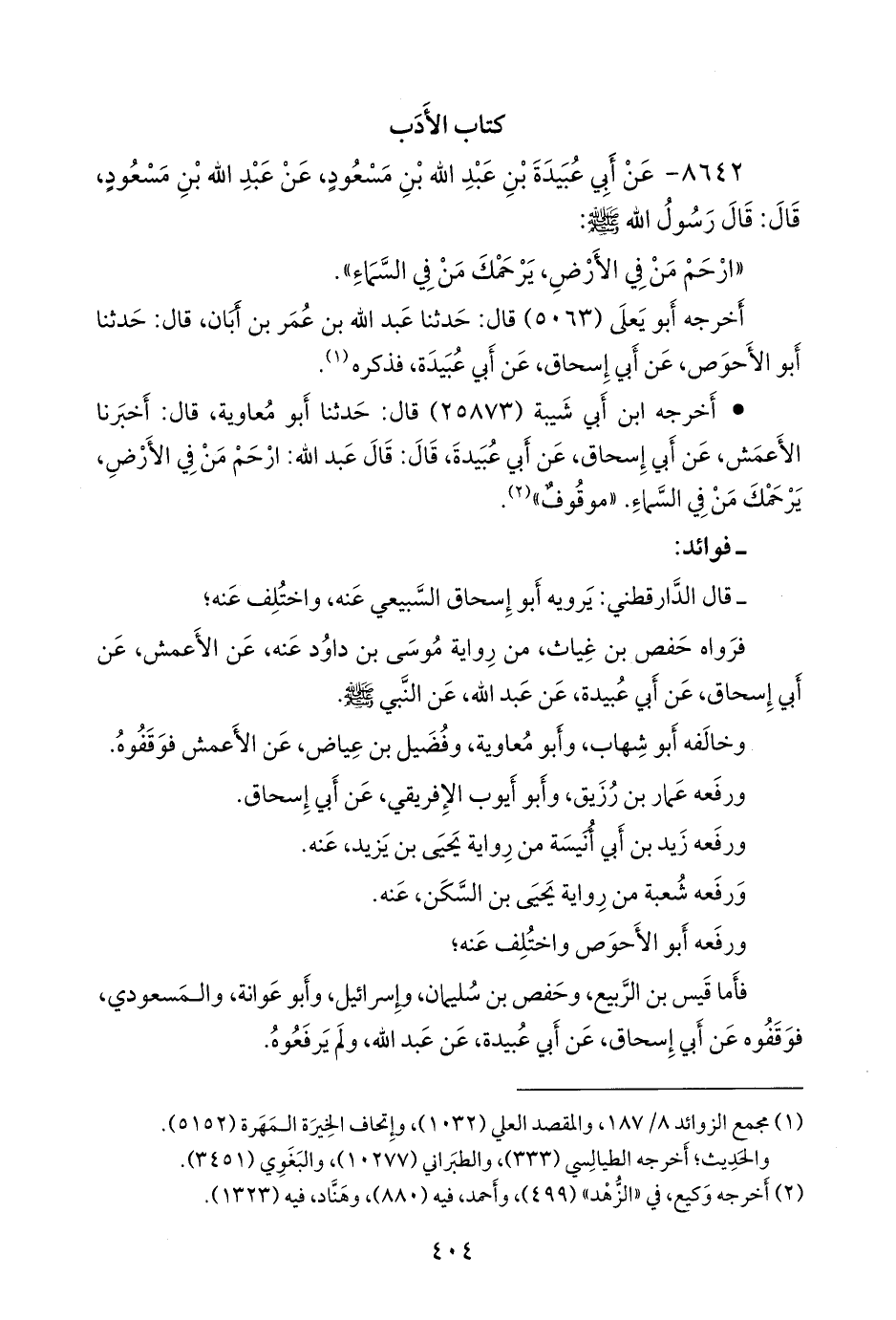 - أَخرجه ابن أبي شيبة (٢٥٨٧٣) قال: حدثنا أَبو معاوية, قال: أخبرنا الأعمش، عن أبي إسحاق، عن أبي عبيدة، قال: قال عبد الله: ارحم من في الأرض، يرحمك من في السماء. «موقوف» (¬٢).