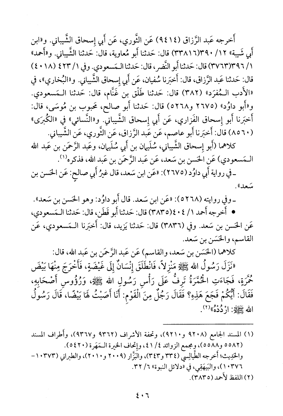 وفي ١/ ٤٢٣ (٤٠١٨) قال: حدثنا عبد الرزاق، قال: أخبرنا سفيان، عن أبي إسحاق الشيباني. و «البخاري» في «الأدب المفرد» (٣٨٢) قال: حدثنا طلق بن غنام، قال: حدثنا المَسعودي. و «أَبو داود» (٢٦٧٥ و ٥٢٦٨) قال: حدثنا أَبو صالح، محبوب بن موسى، قال: أخبرنا أَبو إسحاق الفزاري، عن أبي إسحاق الشيباني. و «النَّسَائي» في «الكبرى» (٨٥٦٠) قال: أخبرنا أَبو عاصم، عن عبد الرزاق، عن الثوري، عن الشيباني.