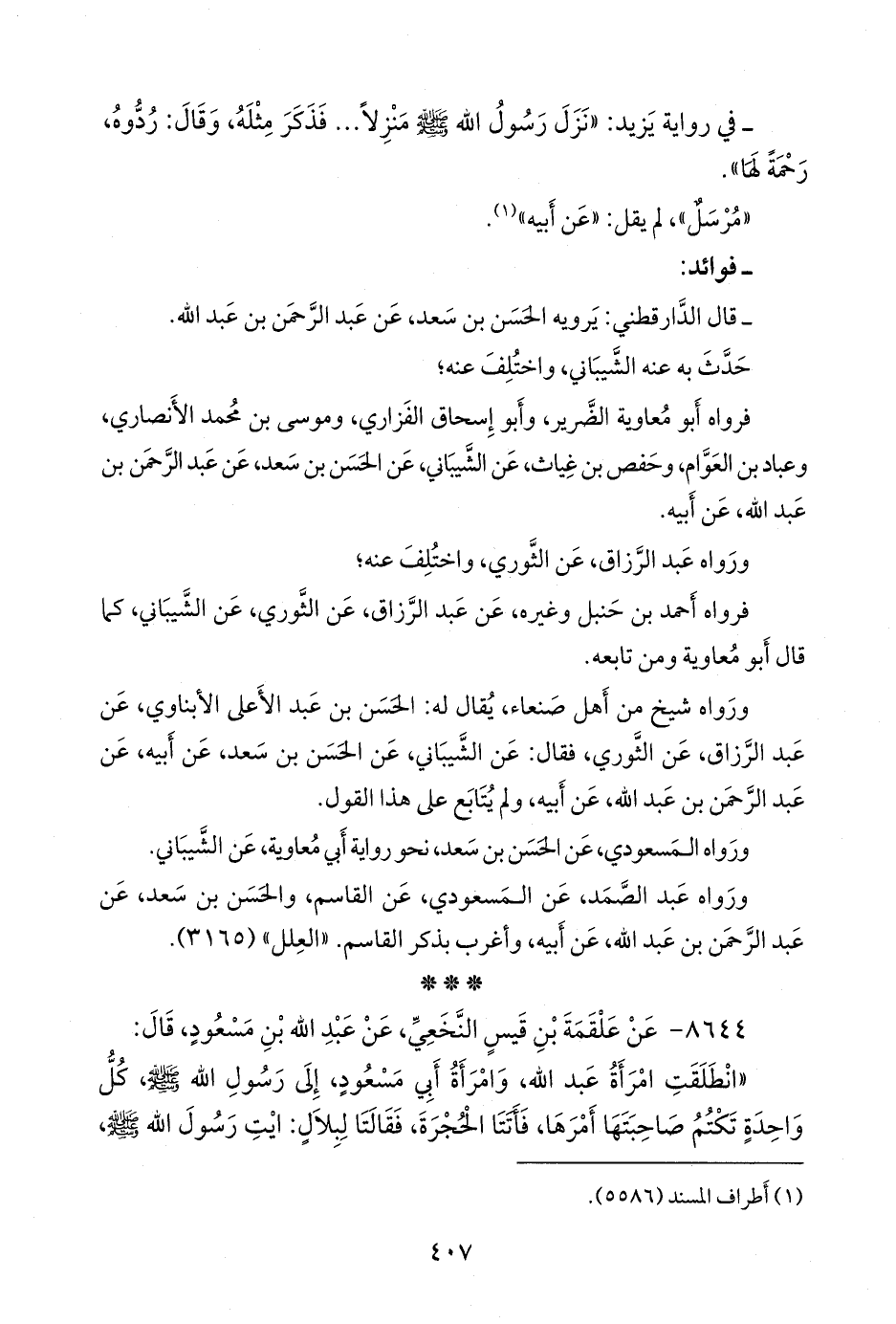 ورواه عبد الصمد، عن المَسعودي، عن القاسم، والحسن بن سعد، عن عبد الرَّحمَن بن عبد الله، عن أبيه، وأغرب بذكر القاسم. «العلل» (٣١٦٥).