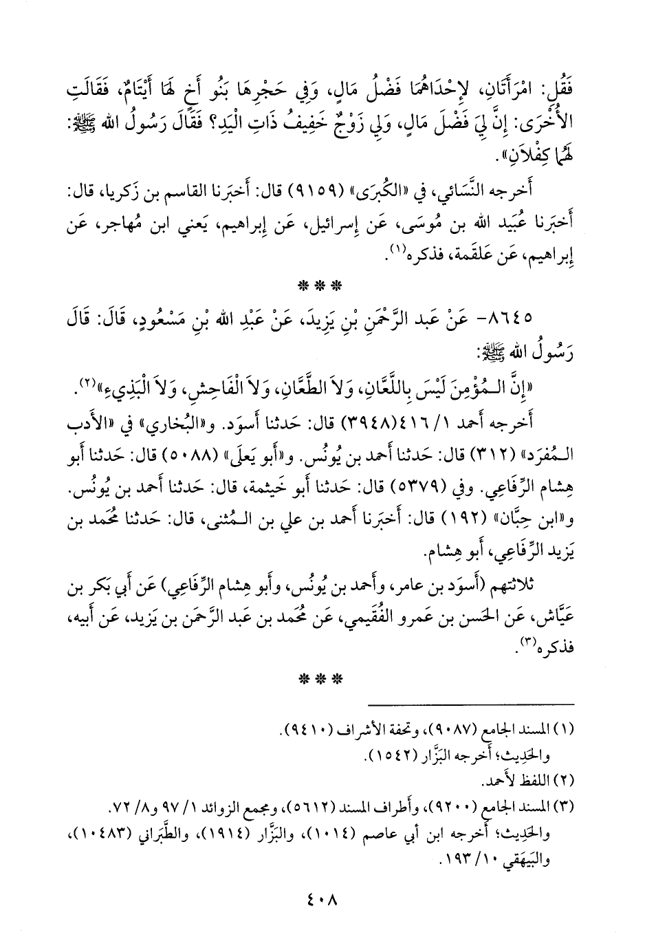 ٨٦٤٥ - عن عبد الرَّحمَن بن يزيد، عن عبد الله بن مسعود، قال: قال رسول الله صَلى الله عَليه وسَلم: