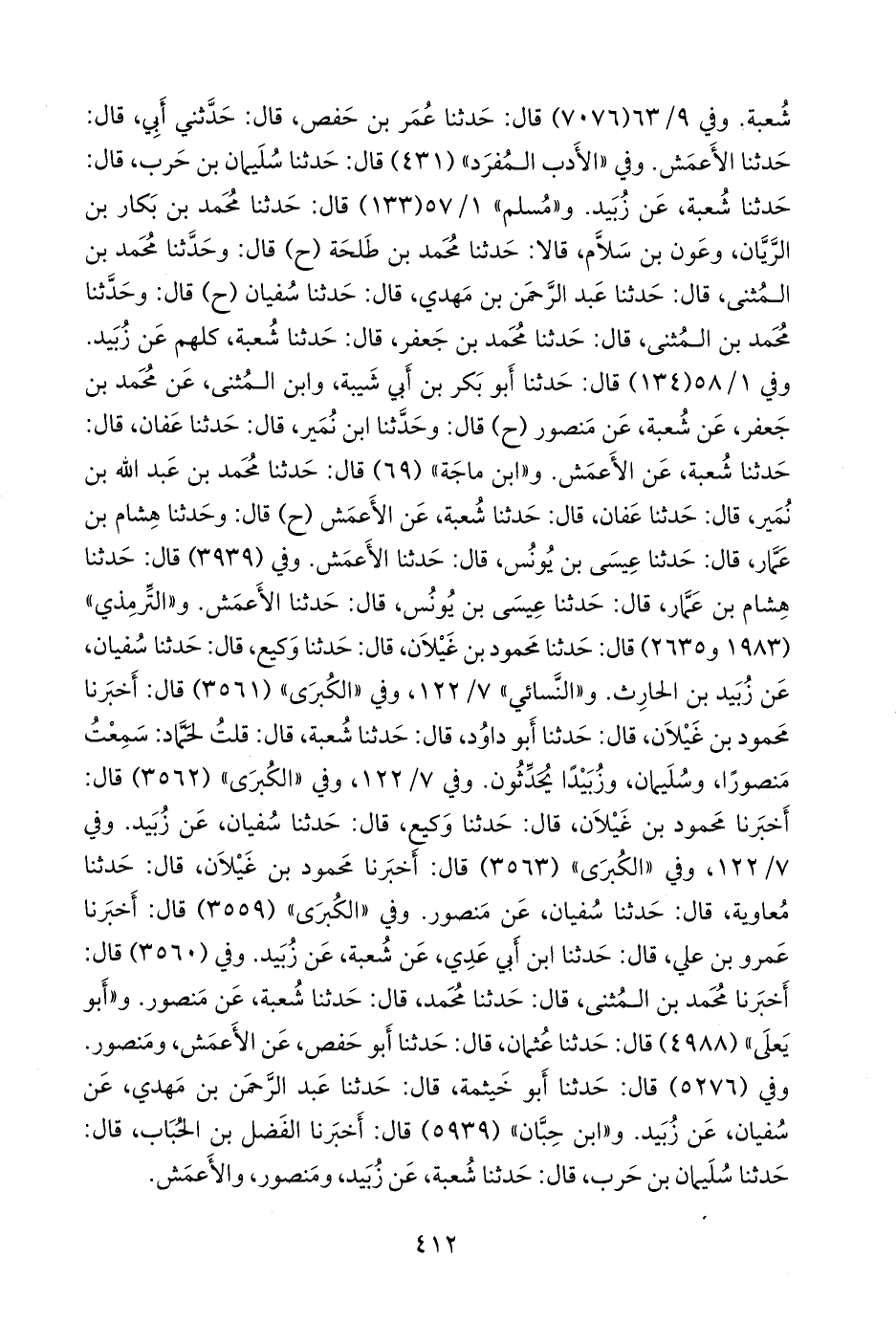 و «ابن ماجة» (٦٩) قال: حدثنا محمد بن عبد الله بن نُمير، قال: حدثنا عفان، قال: حدثنا شعبة، عن الأعمش (ح) قال: وحدثنا هشام بن عمار، قال: حدثنا عيسى بن يونس، قال: حدثنا الأعمش. وفي (٣٩٣٩) قال: حدثنا هشام بن عمار، قال: حدثنا عيسى بن يونس، قال: حدثنا الأعمش. و «التِّرمِذي» (١٩٨٣ و ٢٦٣٥) قال: حدثنا محمود بن غَيلان، قال: حدثنا وكيع، قال: حدثنا سفيان، عن زبيد بن الحارث. و «النَّسَائي» ٧/ ١٢٢، وفي «الكبرى» (٣٥٦١) قال: أخبرنا محمود بن غَيلان، قال: حدثنا أَبو داود، قال: حدثنا شعبة، قال: قلت لحماد: سمعت منصورا، وسليمان، وزبيدا يحدثون. وفي ٧/ ١٢٢، وفي «الكبرى» (٣٥٦٢) قال: أخبرنا محمود بن غَيلان، قال: حدثنا وكيع، قال: حدثنا سفيان، عن زبيد. وفي ٧/ ١٢٢، وفي «الكبرى» (٣٥٦٣) قال: أخبرنا محمود بن غَيلان، قال: حدثنا معاوية، قال: حدثنا سفيان، عن منصور. وفي «الكبرى» (٣٥٥٩) قال: أخبرنا عَمرو بن علي، قال: حدثنا ابن أَبي عَدي، عن شعبة، عن زبيد. وفي (٣٥٦٠) قال: أخبرنا محمد بن المثنى، قال: حدثنا محمد، قال: حدثنا شعبة، عن منصور. و «أَبو يَعلى» (٤٩٨٨) قال: حدثنا عثمان، قال: حدثنا أَبو حفص، عن الأعمش، ومنصور. وفي (٥٢٧٦) قال: حدثنا أَبو خيثمة، قال: حدثنا عبد الرَّحمَن بن مهدي، عن سفيان، عن زبيد. و «ابن حِبَّان» (٥٩٣٩) قال: أخبرنا الفضل بن الحُبَاب، قال: حدثنا سليمان بن حرب، قال: حدثنا شعبة، عن زبيد، ومنصور، والأعمش.