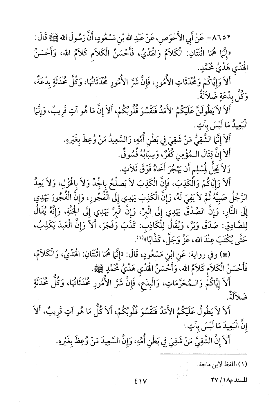 - وفي رواية: «عن ابن مسعود، قال: إنما هما اثنتان: الهدي، والكلام، فأحسن الكلام كلام الله، وأحسن الهدي هدي محمد صَلى الله عَليه وسَلم.