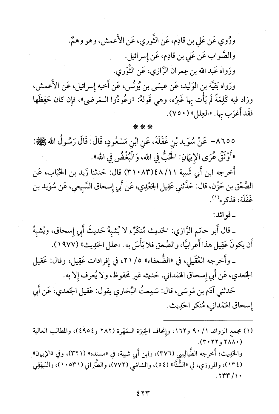 - وقال ابن عَدي: سمعت ابن حماد يقول: قال البخاري: عقيل الجعدي، عن أبي إسحاق، عن سويد بن غفلة، منكر الحديث.