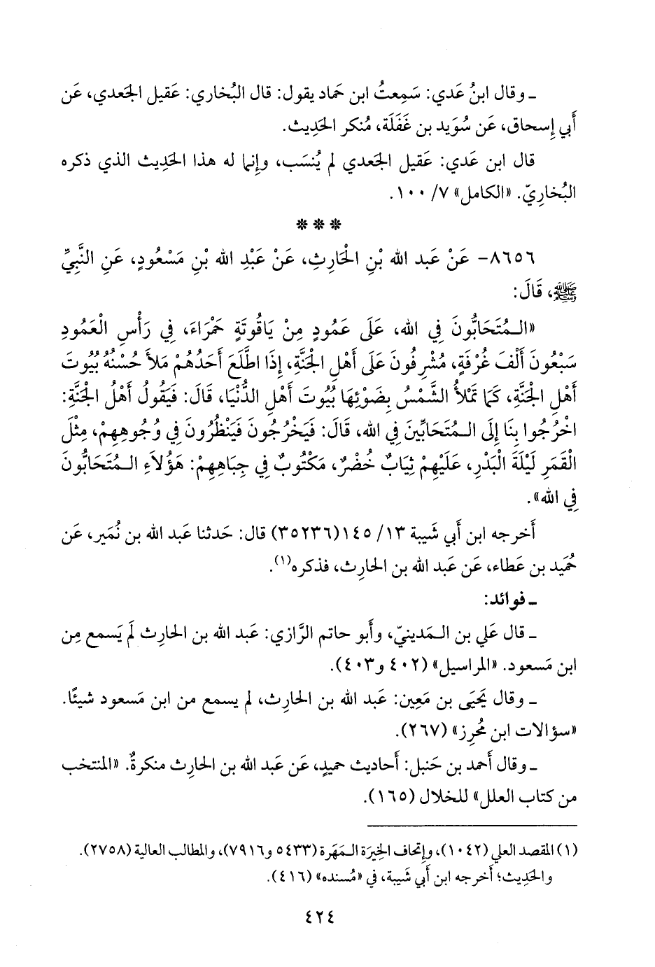 - قال علي بن المديني، وأَبو حاتم الرازي: عبد الله بن الحارث لم يسمع من ابن مسعود. «المراسيل» (٤٠٢ و ٤٠٣).