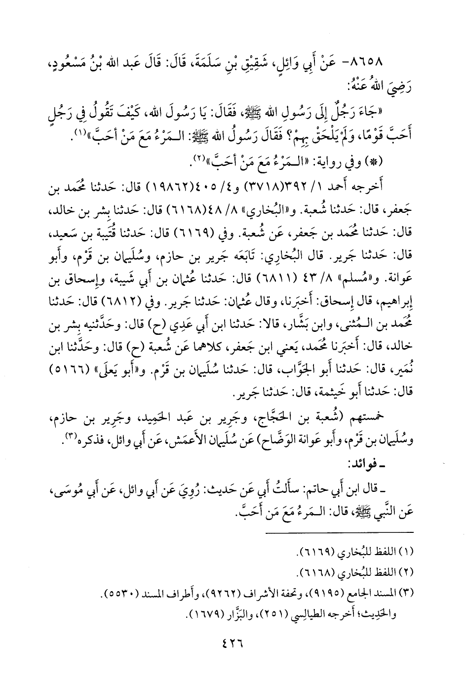 - قال عبد الرَّحمَن بن أبي حاتم الرازي: سألت أبي عن حديث: روي عن أبي وائل، عن أبي موسى، عن النبي صَلى الله عَليه وسَلم، قال: المرء مع من أحب.